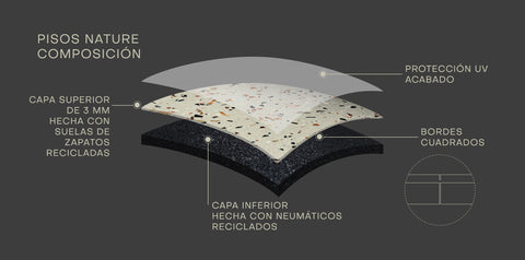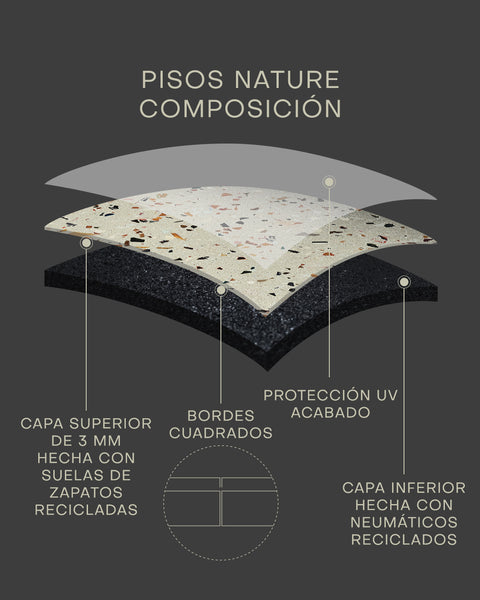 Hecho con 90% de suelas de zapatos recicladas, el Piso Deportivo Nature ofrece un Toque Suave, brindando confort y sensación premium. Su amplia gama de colores permite total personalización, mientras que la superficie más lisa facilita la limpieza y favorece la salud. Con absorción de impactos y un aspecto continuo gracias al diseño de borde cuadrado, el Nature destaca entre los pisos deportivos.