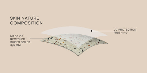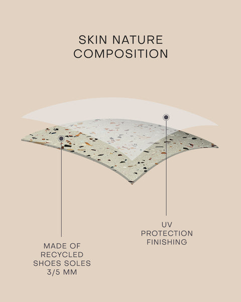 Skin Nature flows naturally—flexible and easy to handle, it's ideal for coverings on walls, floors, ceilings, woodwork, and objects. Made from recycled shoe soles and 100% made in Portugal, it brings sustainability and character to every surface.