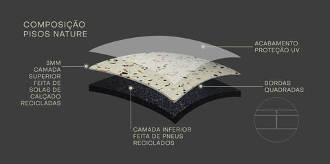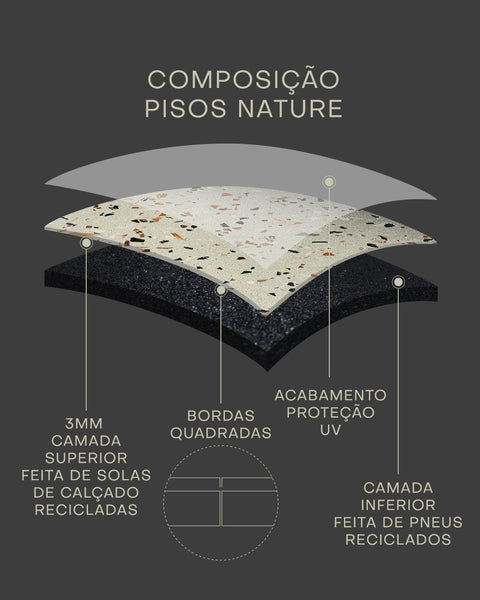 Feito com 90% de solas de sapatilhas recicladas, o Piso Desportivo Nature oferece um Toque Suave, garantindo conforto e sensação premium. A sua ampla variedade de cores permite total personalização, enquanto a superfície mais lisa facilita a limpeza e promove melhor saúde. Com absorção de impacto e aspeto contínuo graças ao design de borda quadrada, o Nature se destaca entre os pisos esportivos.