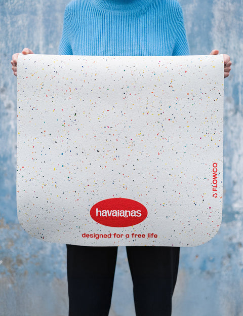 A parceria Havaianas x Flowco nasceu com o objetivo de reciclar chinelos Havaianas antigos devolvidos em lojas selecionadas. Juntos, produzimos um novo tapete de ioga para ser presenteado aos funcionários dos escritórios europeus da Havaianas, que visa ser o primeiro passo nesta longa jornada rumo à sustentabilidade e à valorização de resíduos. Desenvolvemos estes tapetes em três cores: preto, camelo e branco.